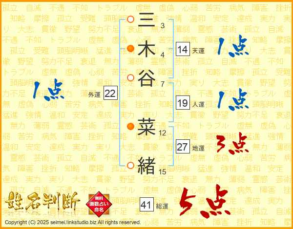 三(3画)木(4画)谷(7画) 菜(12画)緒(15画)