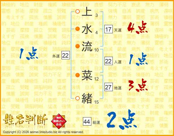 上(3画)水(4画)流(10画) 菜(12画)緒(15画)