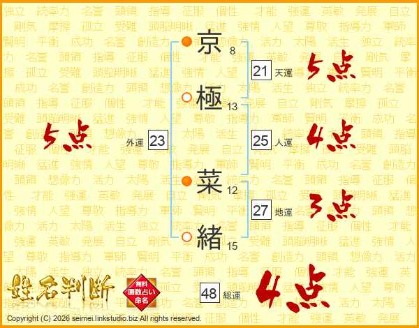京(8画)極(13画) 菜(12画)緒(15画)