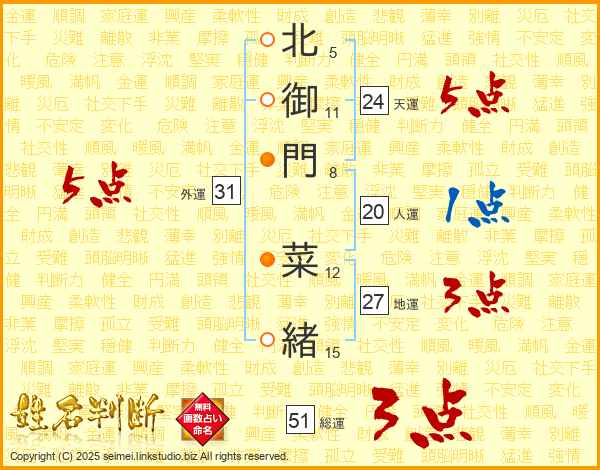 北(5画)御(11画)門(8画) 菜(12画)緒(15画)