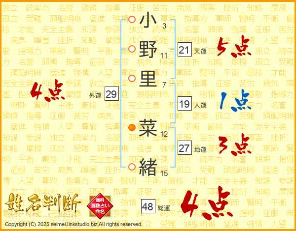 小野里菜緒さんの総運は48画の4点!