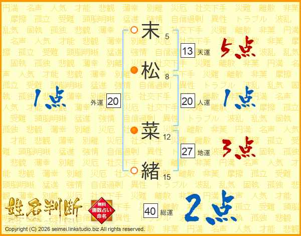 生活面を象徴する運勢です。外部から受ける影響力を表し、結婚運、家庭運や職場、環境への順応性を表します。総運から人運を引いた画数。姓や名が1文字の場合を除く。