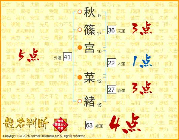秋(9画)篠(17画)宮(10画) 菜(12画)緒(15画)