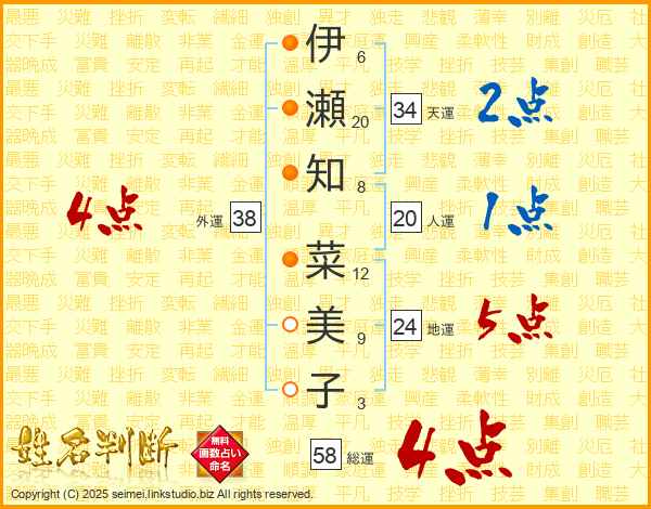 伊瀬知菜美子さんの総運は58画の4点!