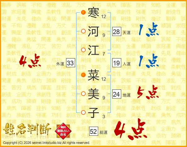 寒河江菜美子さんの総運は52画の4点!