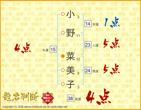 小(3画)野(11画) 菜(12画)美(9画)子(3画)