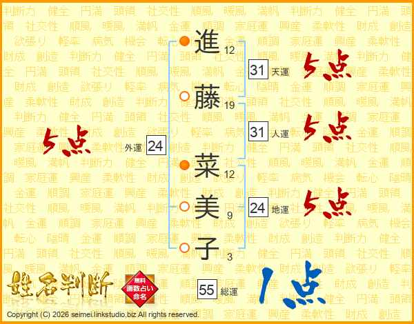 進(12画)藤(19画) 菜(12画)美(9画)子(3画)