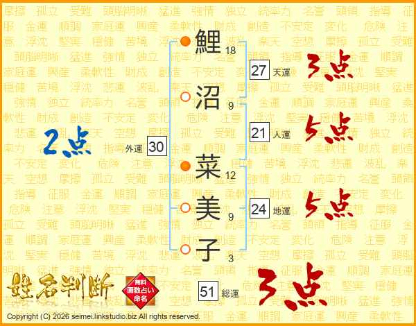 鯉(18画)沼(9画) 菜(12画)美(9画)子(3画)