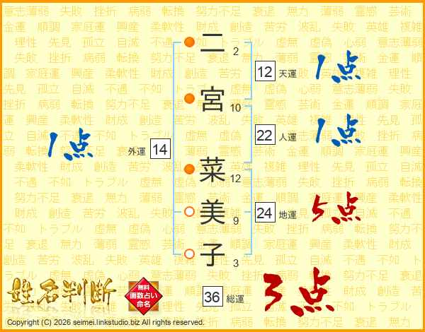 二(2画)宮(10画) 菜(12画)美(9画)子(3画)