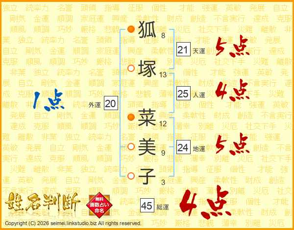 狐(8画)塚(13画) 菜(12画)美(9画)子(3画)
