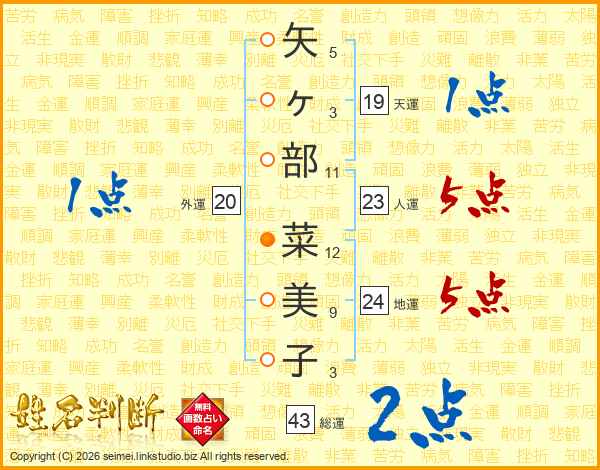 矢(5画)ヶ(3画)部(11画) 菜(12画)美(9画)子(3画)