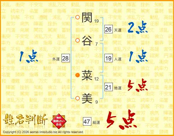 関(19画)谷(7画) 菜(12画)美(9画)