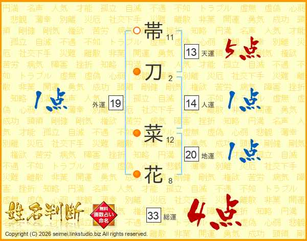 帯(11画)刀(2画) 菜(12画)花(8画)