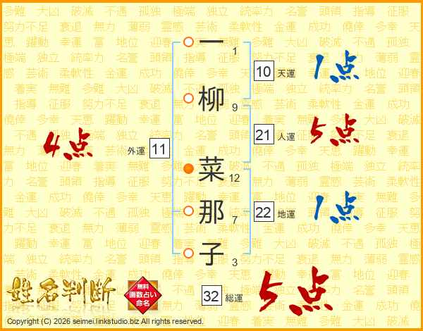 一(1画)柳(9画) 菜(12画)那(7画)子(3画)