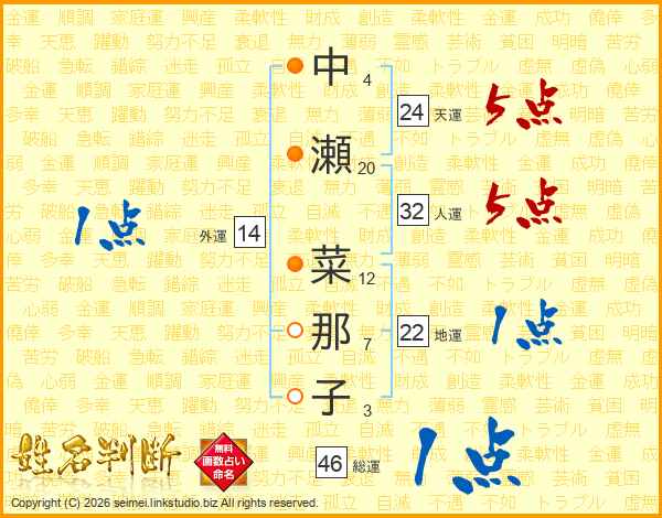 中瀬菜那子さんの総運は46画の1点!