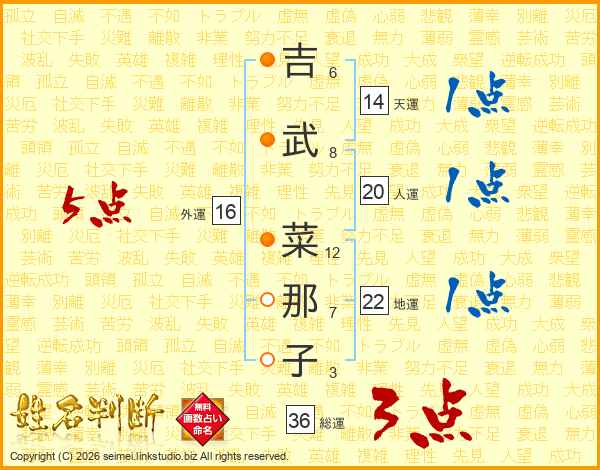 吉(6画)武(8画) 菜(12画)那(7画)子(3画)
