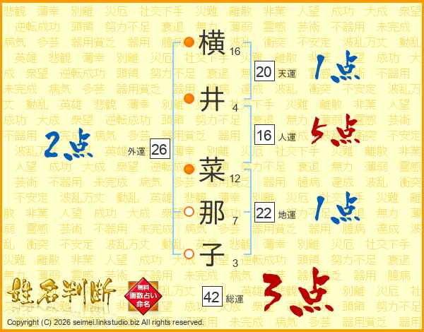 横(16画)井(4画) 菜(12画)那(7画)子(3画)