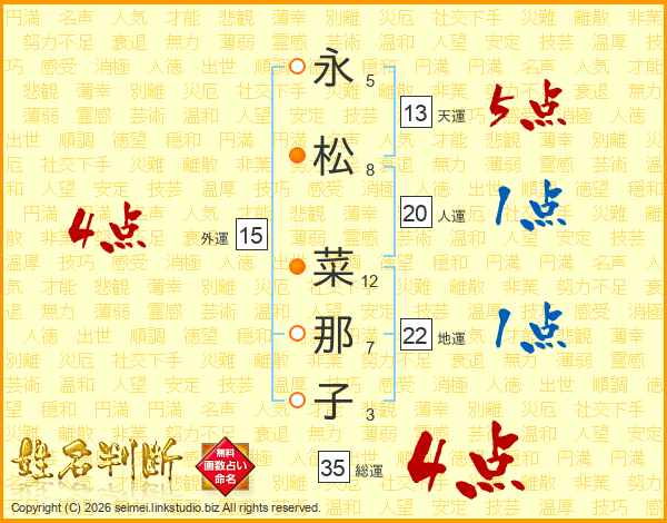 永(5画)松(8画) 菜(12画)那(7画)子(3画)