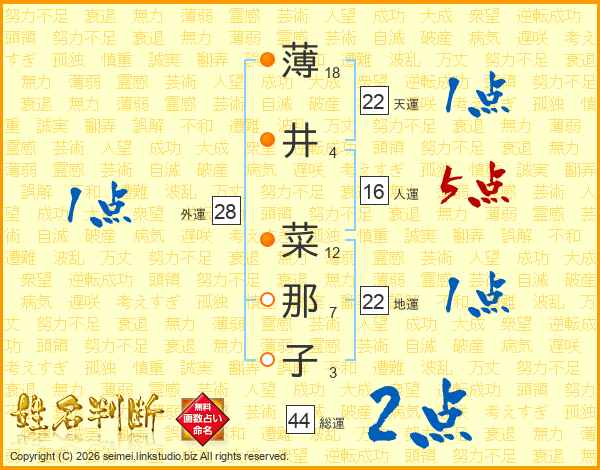 薄(18画)井(4画) 菜(12画)那(7画)子(3画)