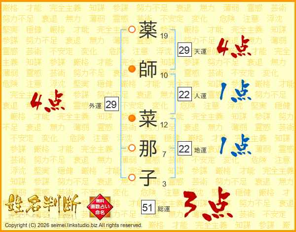 薬(19画)師(10画) 菜(12画)那(7画)子(3画)