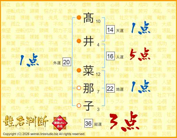 髙(10画)井(4画) 菜(12画)那(7画)子(3画)