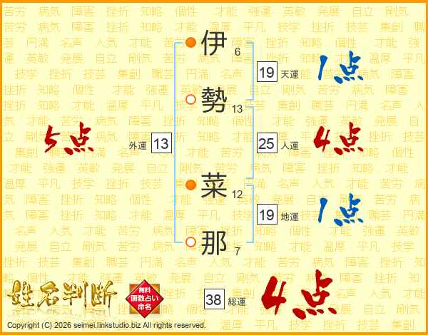 伊(6画)勢(13画) 菜(12画)那(7画)