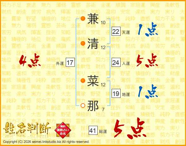 兼清菜那さんの総運は41画の5点!