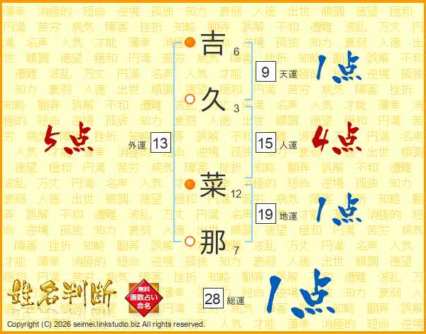 吉(6画)久(3画) 菜(12画)那(7画)