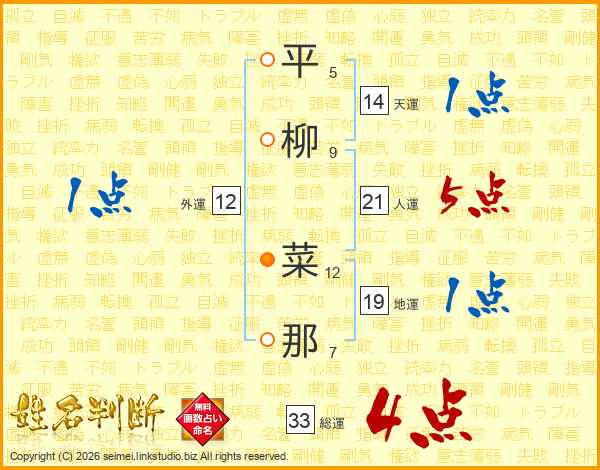 生活面を象徴する運勢です。外部から受ける影響力を表し、結婚運、家庭運や職場、環境への順応性を表します。総運から人運を引いた画数。姓や名が1文字の場合を除く。