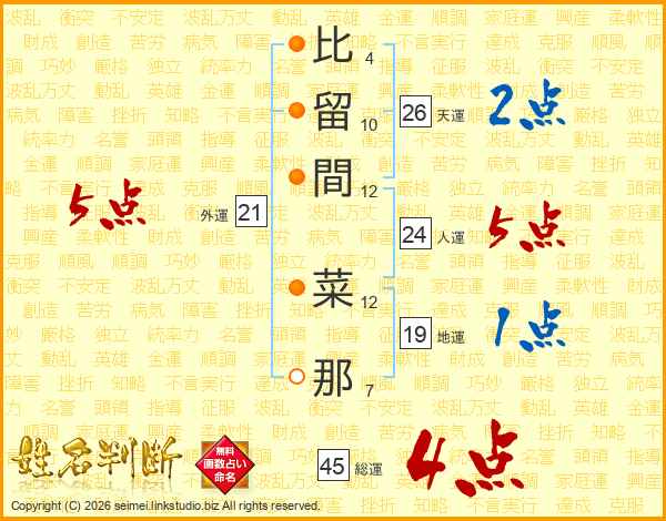 比(4画)留(10画)間(12画) 菜(12画)那(7画)