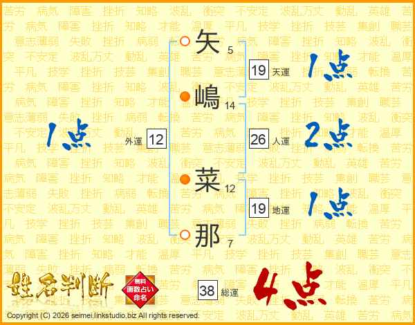 矢嶋菜那さんの総運は38画の4点!