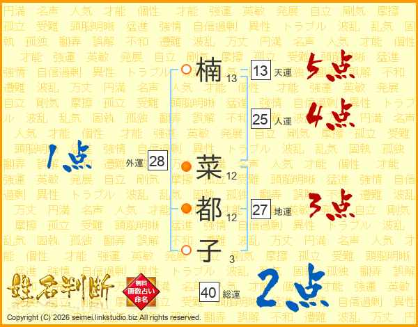生活面を象徴する運勢です。外部から受ける影響力を表し、結婚運、家庭運や職場、環境への順応性を表します。総運から人運を引いた画数。姓や名が1文字の場合を除く。