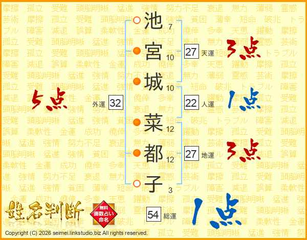 池(7画)宮(10画)城(10画) 菜(12画)都(12画)子(3画)