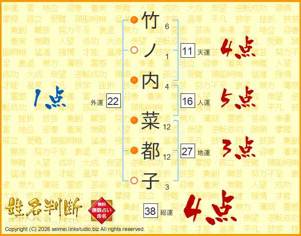竹ノ内菜都子さんの総運は38画の4点!