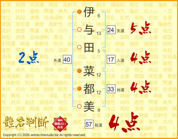 伊(6画)与(13画)田(5画) 菜(12画)都(12画)美(9画)