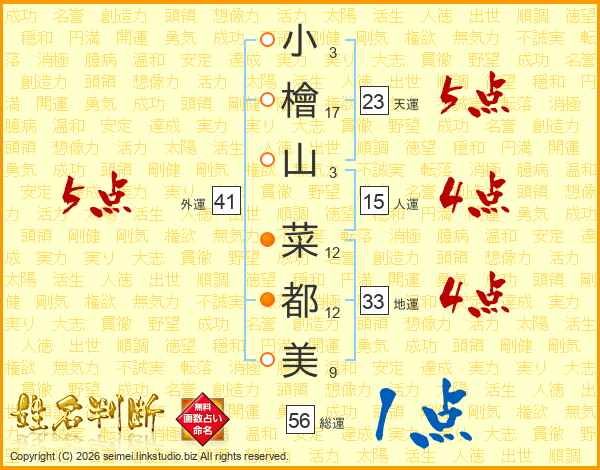 小(3画)檜(17画)山(3画) 菜(12画)都(12画)美(9画)