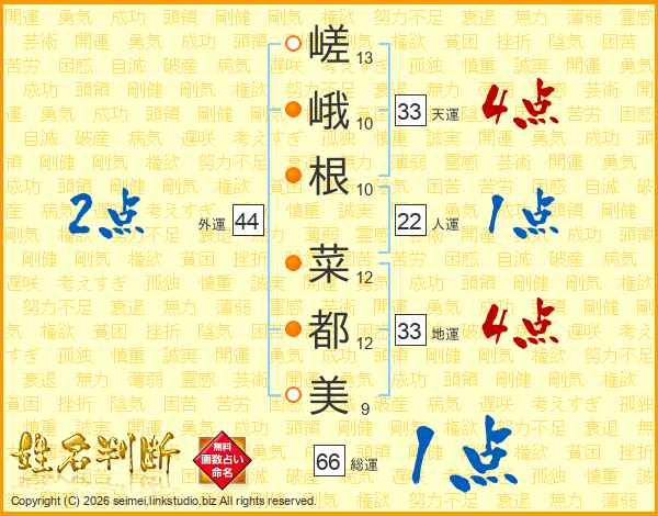 嵯(13画)峨(10画)根(10画) 菜(12画)都(12画)美(9画)