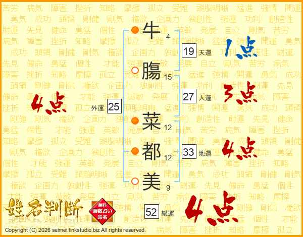 牛膓菜都美さんの総運は52画の4点!