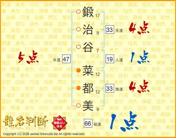 鍛(17画)治(9画)谷(7画) 菜(12画)都(12画)美(9画)
