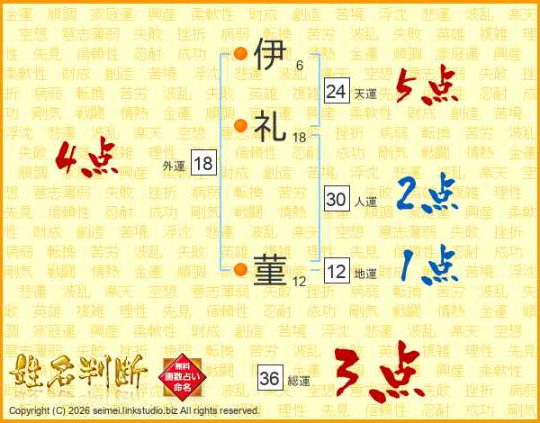 画数の奇数(○陽)と偶数(●陰)の配列で吉凶を占います。どちらかにかたよる名前は大凶名で避ける必要があります。画数の奇数偶数。