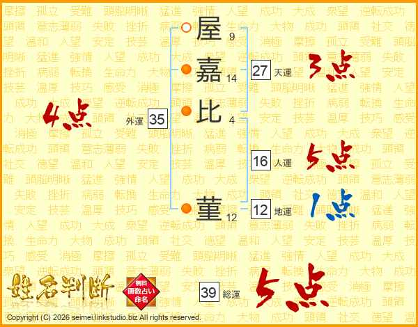 屋(9画)嘉(14画)比(4画) 菫(12画)
