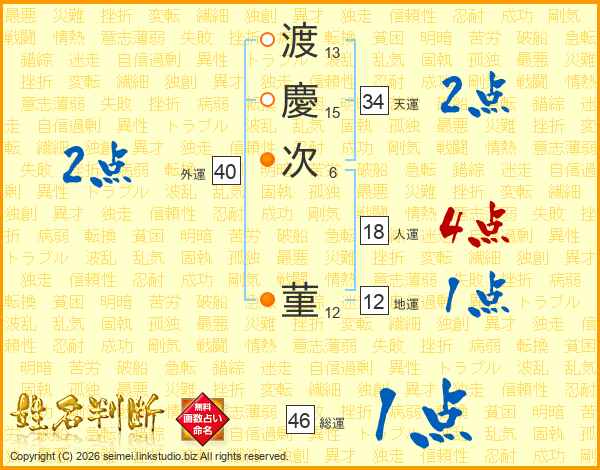 渡(13画)慶(15画)次(6画) 菫(12画)
