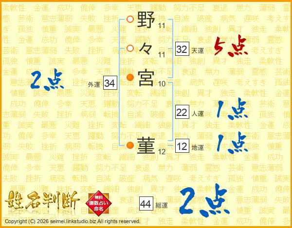 生活面を象徴する運勢です。外部から受ける影響力を表し、結婚運、家庭運や職場、環境への順応性を表します。総運から人運を引いた画数。姓や名が1文字の場合を除く。