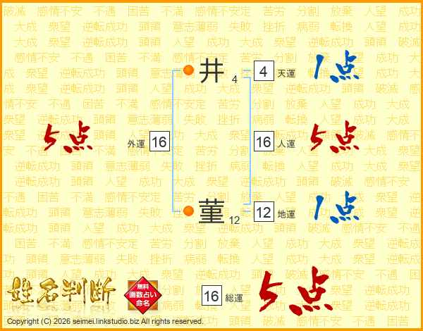 あなたの人生を表す1番重要な運勢です。生涯を通じて影響する総合運となり、主に50歳以降の晩年期に影響を及ぼします。苗字と名前の合計画数。