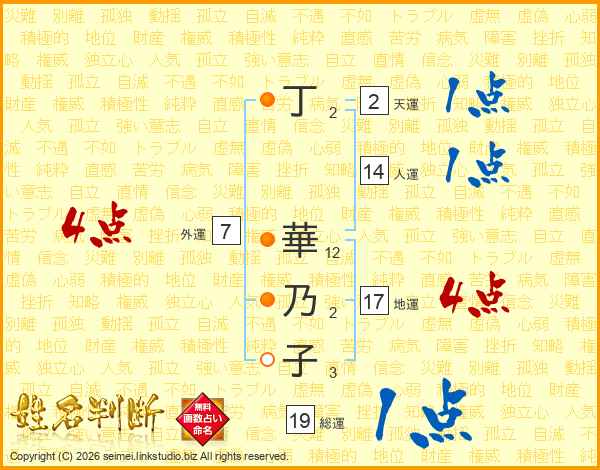 生活面を象徴する運勢です。外部から受ける影響力を表し、結婚運、家庭運や職場、環境への順応性を表します。総運から人運を引いた画数。姓や名が1文字の場合を除く。