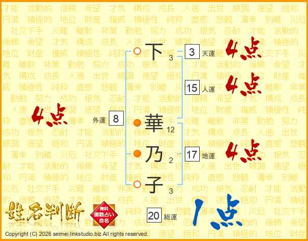 生活面を象徴する運勢です。外部から受ける影響力を表し、結婚運、家庭運や職場、環境への順応性を表します。総運から人運を引いた画数。姓や名が1文字の場合を除く。