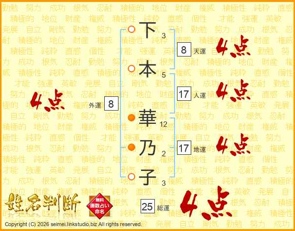 下(3画)本(5画) 華(12画)乃(2画)子(3画)
