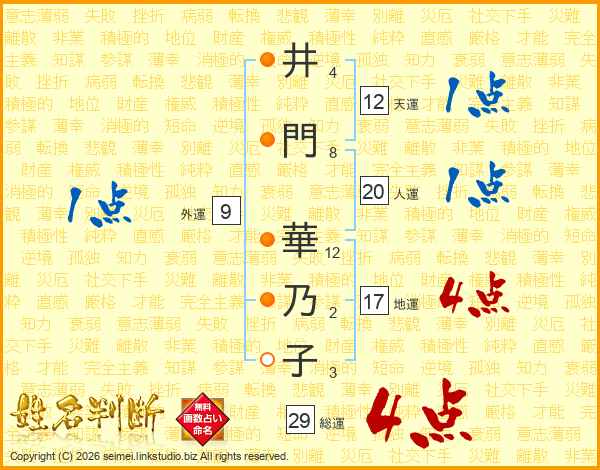 井(4画)門(8画) 華(12画)乃(2画)子(3画)