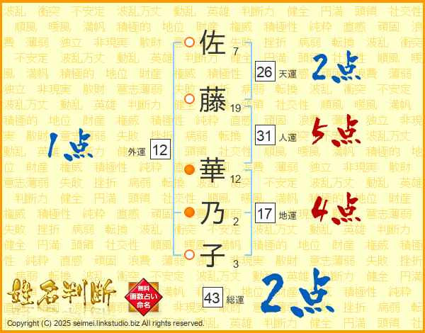 佐(7画)藤(19画) 華(12画)乃(2画)子(3画)