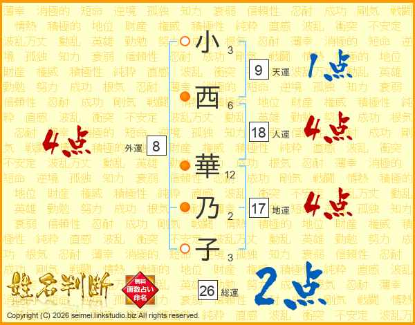 小(3画)西(6画) 華(12画)乃(2画)子(3画)
